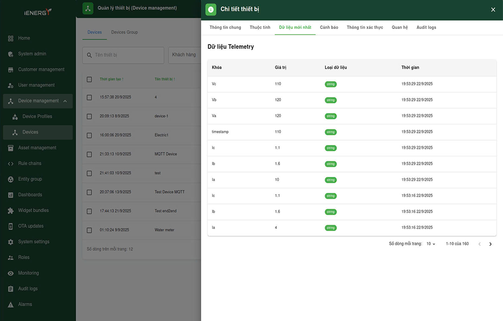 Cho phép theo dõi, tương tác và xem dữ liệu thiết bị theo thời gian thực. Tab “Dữ liệu mới nhất” hiển thị gói tin telemetry chi tiết, hỗ trợ gỡ lỗi và phân tích.